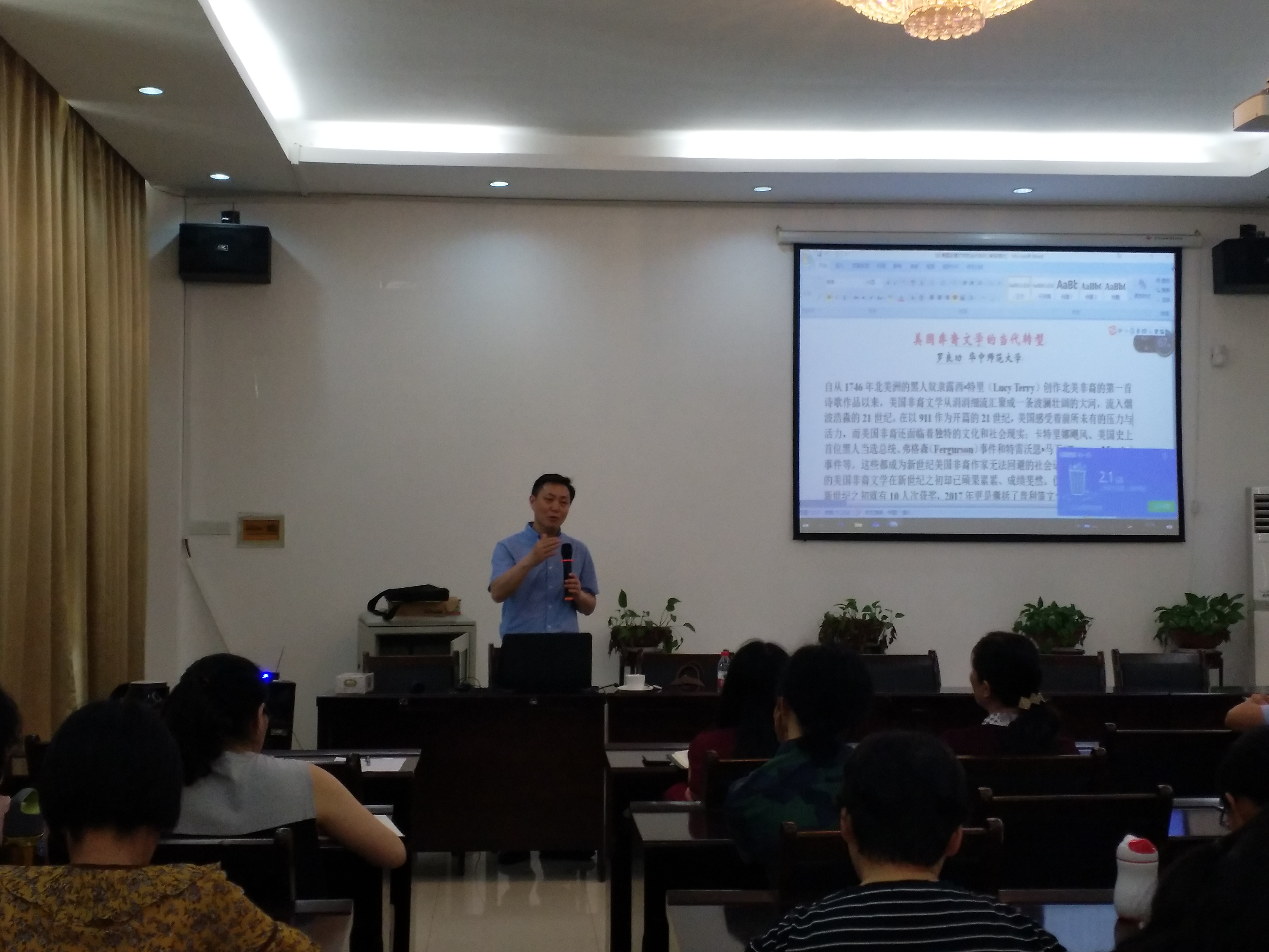 6月20日下午,华中师范大学best365中国官方网站经理、博士研究生导师罗良功教授应邀莅临公司, 做主题为“美国非裔文学的当代转型”的讲座,讲座由副经理袁平华教授主持,公司部分教师、研究生在场聆听此次讲座。