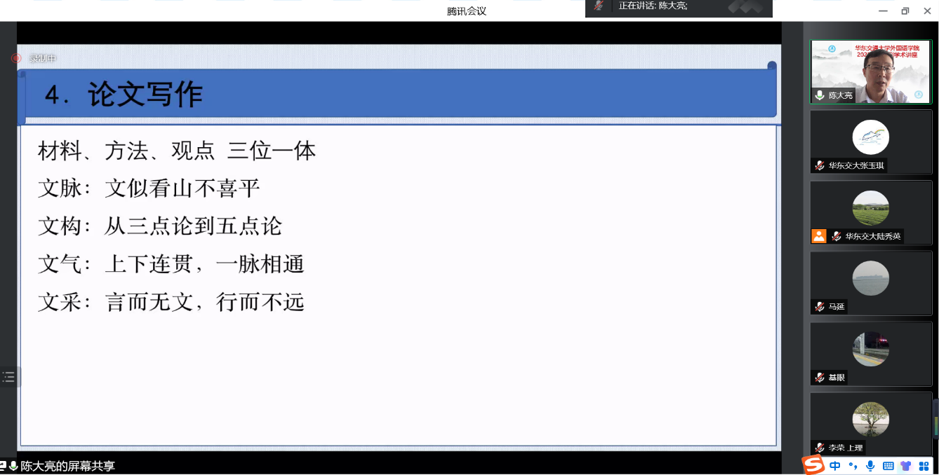 2022年6月15日14:30,苏州大学特聘教授、博士生导师陈大亮教授为公司师生带来了一场题为《科研纵横谈:翻译研究的选题、方法与写作》的学术讲座。本次讲座线上进行,由best365中国官方网站副经理陆秀英教授主持,学院教师、翻译硕士研究生及外校师生约300人参加。
