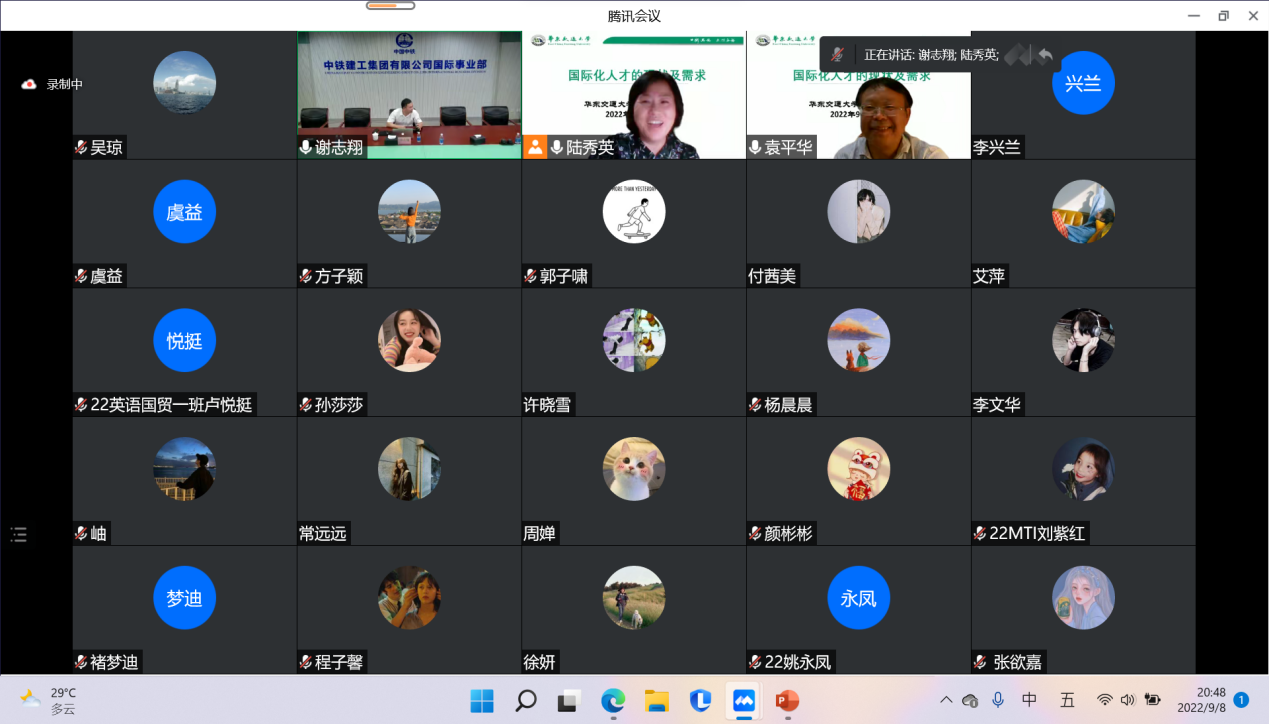 2022年9月8日晚上,中铁建工集团国际事业部(北京)总经理谢志翔应公司邀请在线为学院师生带来一场题为“国际化人才的现状及需求”的线上学术讲座。讲座由学院副经理(负责学院行政工作)袁平华教授主持,并由副经理陆秀英教授总结。
