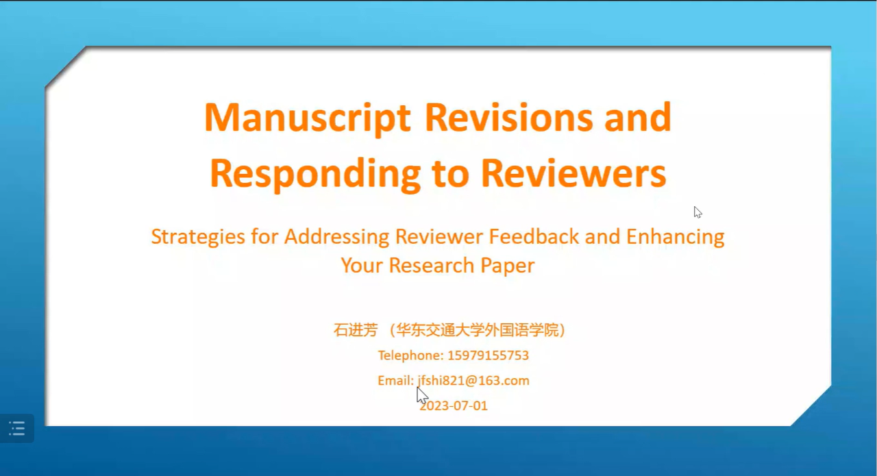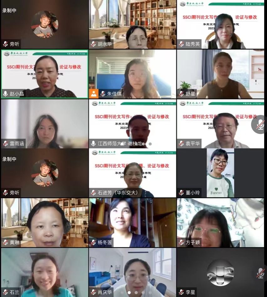 为加强学院团队建设,增强师生对国际期刊论文写作的了解,2023年 7月3日学院举办了主题为“SSCI期刊论文写作:选题、论证与修改”的系列学术讲座。讲座以线上形式进行,由江西师范大学谢枝龙教授、湖南师范大学肖越海教授和best365中国官方网站石进芳教授进行主旨发言,围绕SSCI期刊论文选题、资料搜索、文献阅读与写作、数据收集与实验、数据统计与分析、语言文字与撰写、投稿格式与要求、期刊选择与投稿、审稿意见的修改与回复等层层展开。系列讲座分别由外语学院赵小晶、袁平华、陆秀英老师主持。