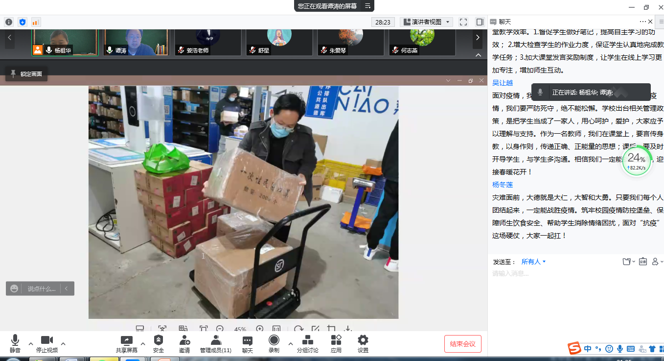 接着,朱爱琴同志讲述了自己作为学院科研与教学管理办公室的主任,为保障停课不停学所做的一些工作。这段时间她都保证手机24小时开机,以应对临时通知和紧急任务。尤其是在16号晚上十一点多紧急通知第二天开始线上教学的时候,部分教师没有及时在微信工作群回复消息,电话也无法打通,她一夜没有睡安稳。第二天清晨六点不到就开始给这部分教师打电话,确保了正常的线上教学秩序。同时,她还先于学校教务要求,整理了学院每位教师线上教学的方式和链接,保证了学院和学校督导能够随机进入课堂听课。由于学校不进不出,无法取回工作电脑,同时教务系统在校外无法使用某些功能,她一方面找技术人员帮忙,一方面积极学习代替办法,克服困难,顺利完成教务方面的各项工作。