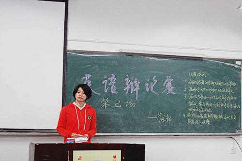 比赛共有3个场地,一个候赛场和两个比赛场,选手们共被分成8组,每组正反方各5人。每组先通过抽签选取辩题,经过10分钟的准备之后进行比赛。虽然今天是初赛,但是依然十分激烈,辩手们凭借灵活巧妙的思辨能力使整个比赛过程高潮迭起。所谓真理越辩越明,只有在争论中才能碰撞出思想的火花。举办方在选取辩题方面也是煞费苦心,力争使每个辩题都具有相当的争辩性。像“canmoney buy happiness?”,“should we expect romance on campus?”等既贴近生活,又能引发激烈辩论。