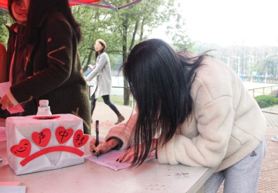 “同学,快来参加我们的答题有奖活动吧,礼品丰厚,还能帮你实现小愿望呢!”工作人员乐此不疲地宣传着。答题活动也如火如荼地进行着:从答题箱中随机抽取一张纸条,纸条上有有关女生节的五道题目,答对三道题目或以上就可以任意挑选除玫瑰花外的礼品。玫瑰花可是“重头戏”,需要转发女生节说说,集赞66个才能领取。外语学院18英语国贸一班的曹静奔着摊位一路小跑而来。“知道今天是女生节,所以昨天特意转发说说,好不容易集满赞了,当然要尽快兑换了。”她笑着说。