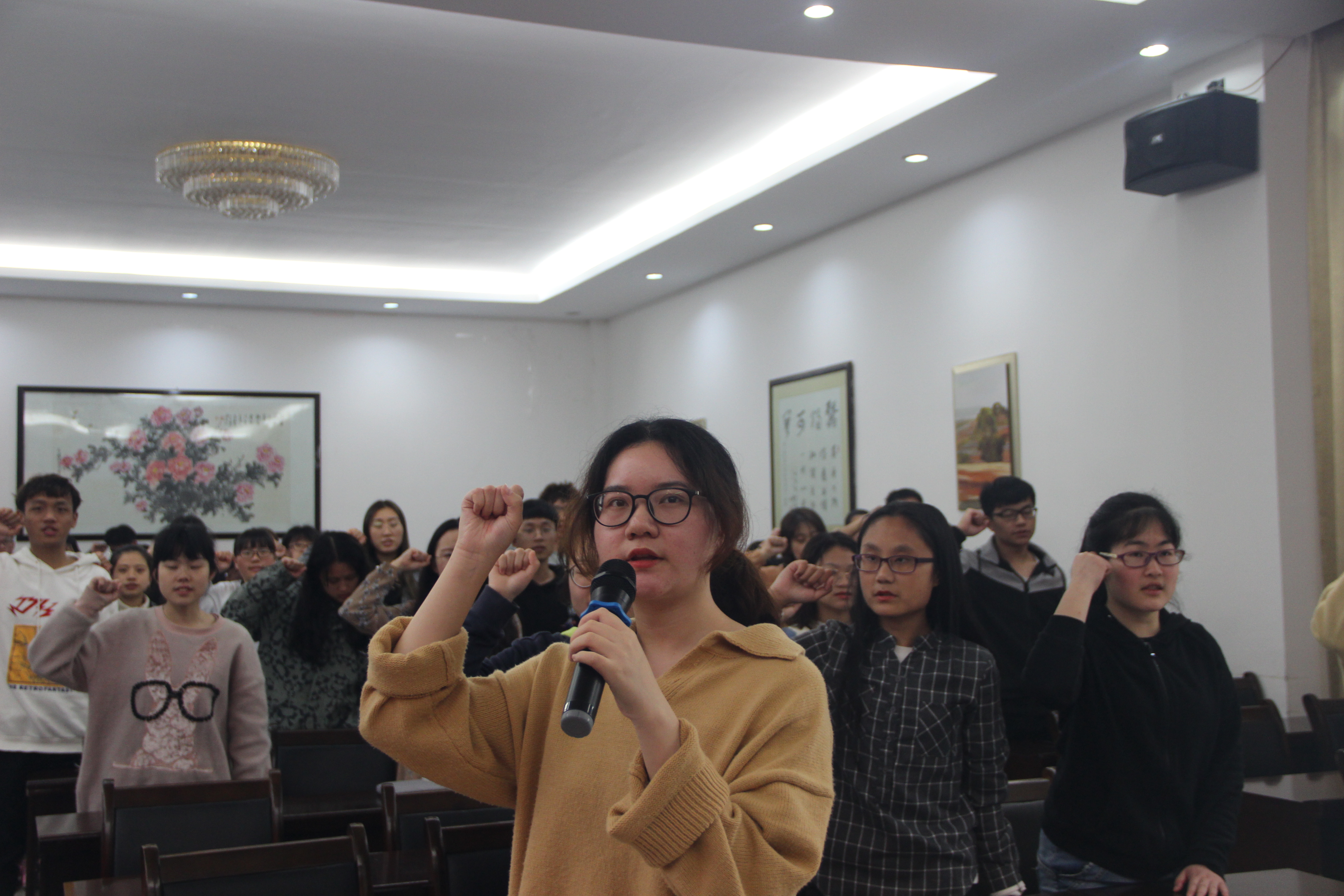 本次主题团日活动共分为六个环节。活动伊始,全体起立,奏唱国歌。同学们高声齐唱,用热情嘹亮的歌声表达对祖国的热爱。紧接着郑伟老师为同学们带来了一堂生动具体的微团课。他详细介绍了五四运动的背景、原因、影响及在这场声势浩大的运动中涌现出的优秀青年人物。他指出五四精神的核心内容为:爱国、进步、民主、科学。我们青年学子应该为了民族的独立和解放,为国家的繁荣与富强前赴后继、英勇奋斗、积极进取、勤奋工作。在团课即将结束时,郑伟老师以习近平总书记对青年学子的五四寄语激励同学们敢于有梦、勇于追梦、勤于圆梦。