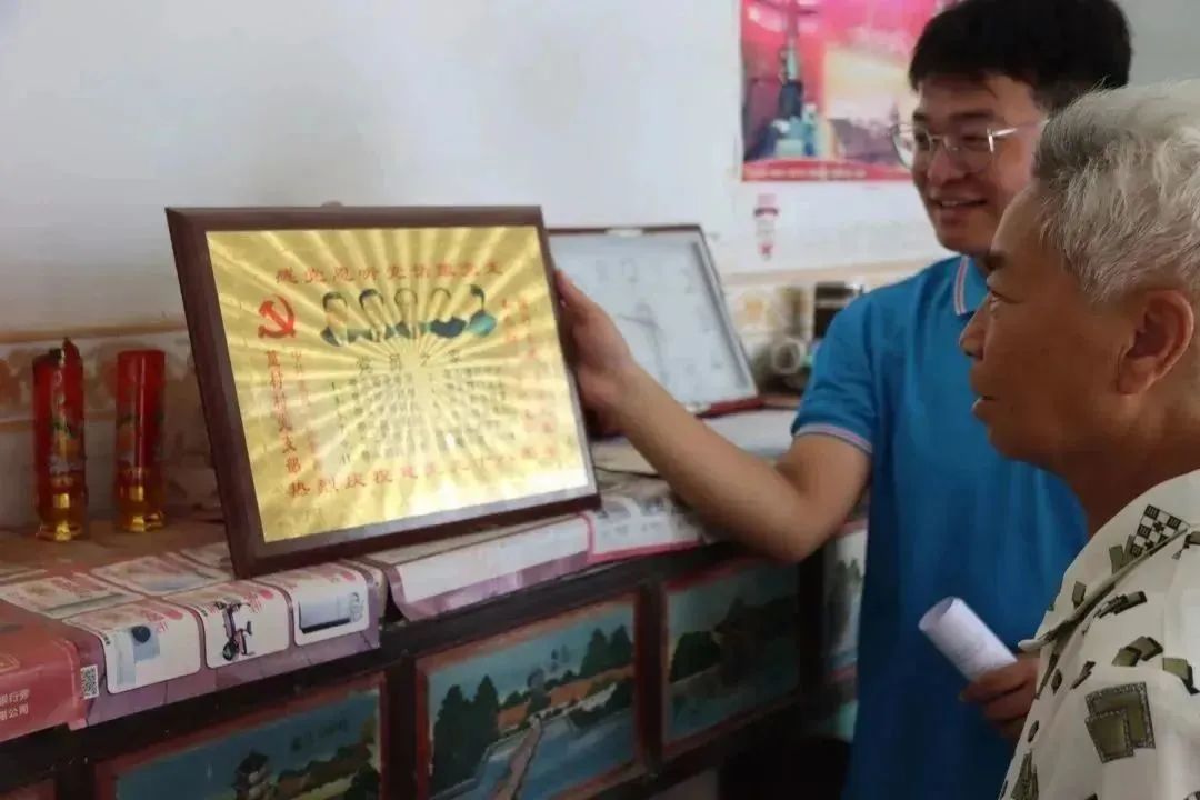 在老党员张金香家中,他向实践队队员们展示了“光荣之家”的牌匾并讲述了他的入党经历。