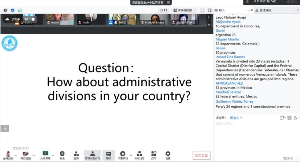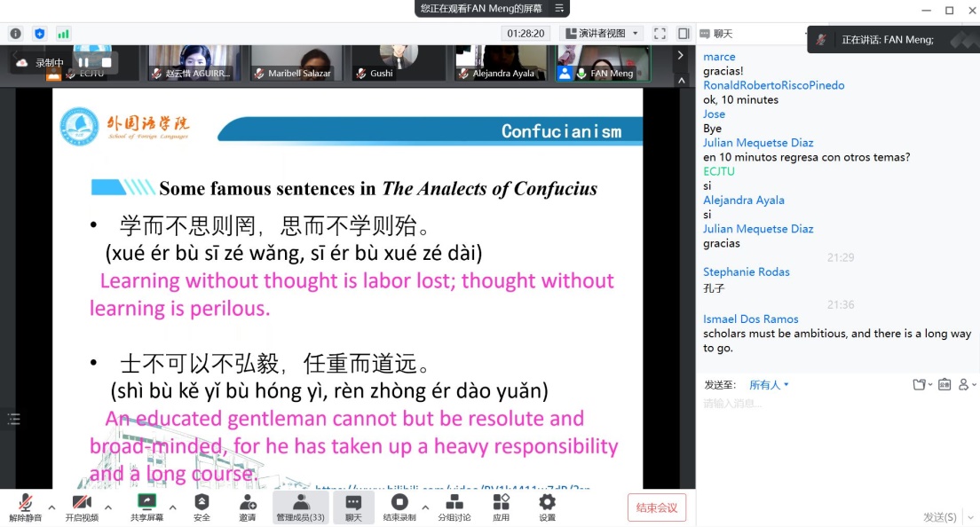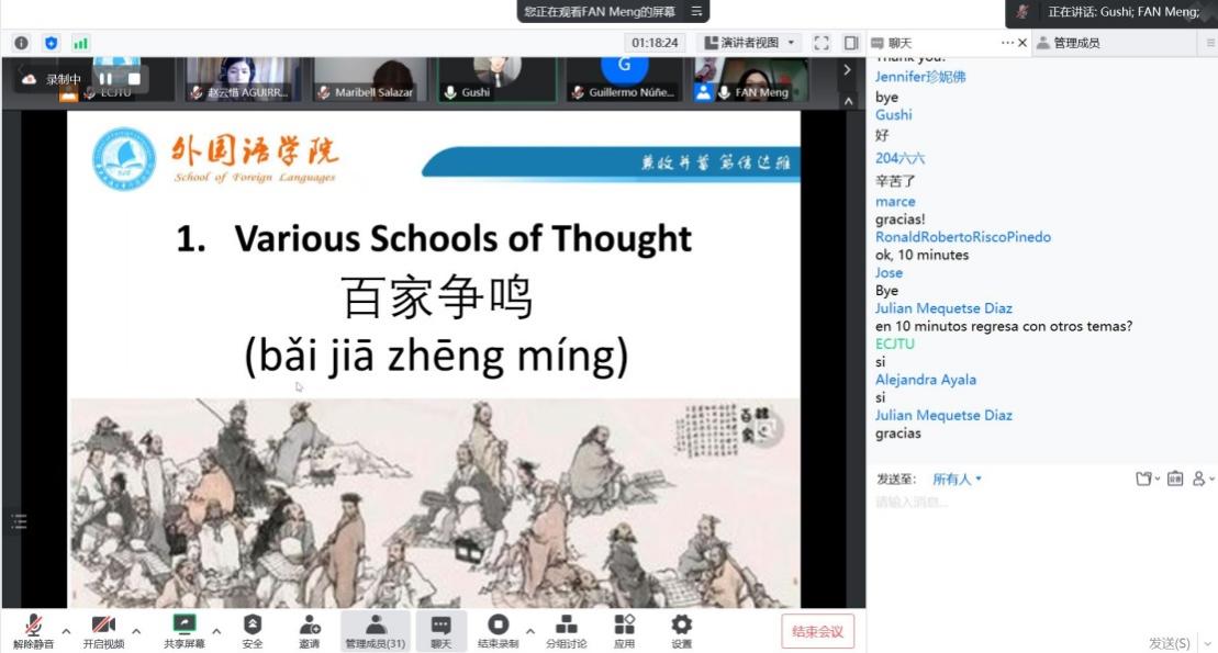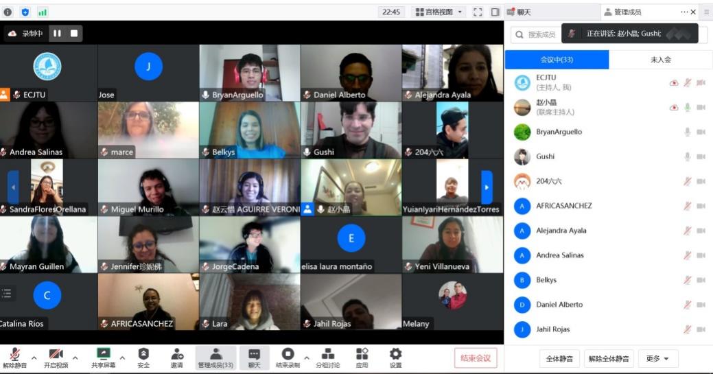 日前,受教育部中外语言合作交流中心委托,公司举办的“遇见中国”美洲西班牙语青年赴华东交大云端夏令营正式拉开帷幕,副经理赵小晶以《中国概况》为主题带来第一场文化讲座。