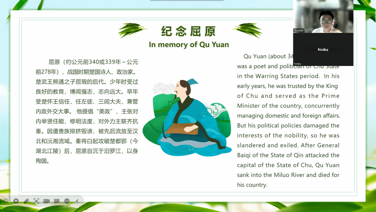 传播中国文化是我报名这次项目的初衷,因此在教学过程中我十分重视对中华文化背景与拓展知识的讲解。例如临近端午的那节课,我在课堂上与员工分享了端午节的相关知识,通过图片和视频的形式让员工们了解了这个节日的传统习俗;还通过讲述屈原的故事,让员工们更好地理解了中国古代的历史和文化;最后通过趣味答题的形式使端午节的知识深刻的印在了员工的脑海中。
