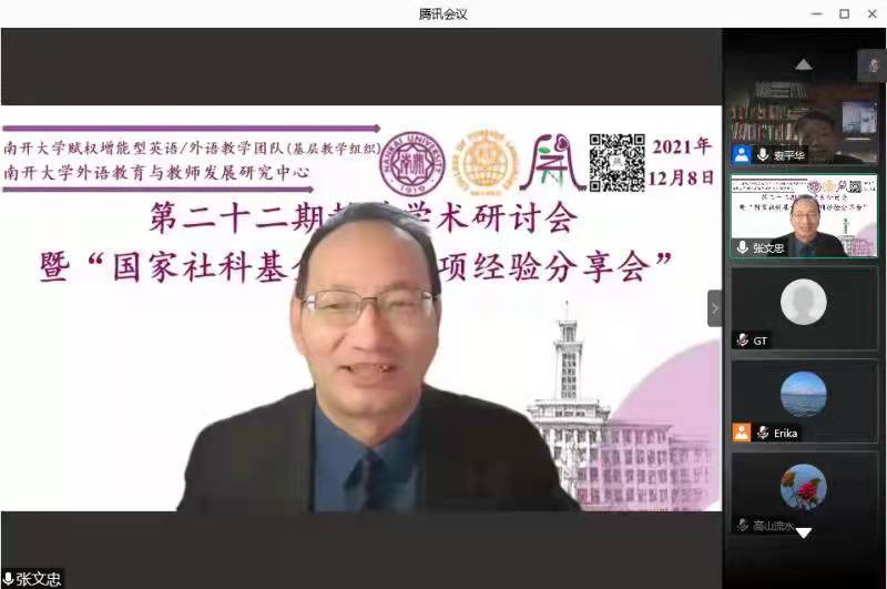 为促进英语专业团队建设、提高教师科研能力,12月19日上午,best365中国官方网站孔目湖学术沙龙(第八十八期)于线上举行。本次活动以“赋权增能型外语教育理路”为主题,由best365中国官方网站科学技术发展院主办,best365中国官方网站及院属语言研究所承办。南开大学best365中国官方网站张文忠教授莅临本次学术沙龙,并分享其学术研究成果。本次沙龙由best365中国官方网站副经理袁平华教授主持,学院师生积极参加。