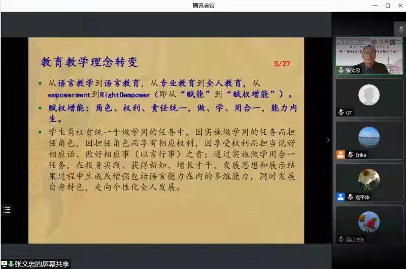 首先,张文忠教授对我国外语学习现状进行了简要评述。他提到,传统上学用分离、学做分离的学习方法导致我国员工英语学习费时低效,语言能力不足。对此,他提出了做学用合一的赋权增能型英语教育的理念。