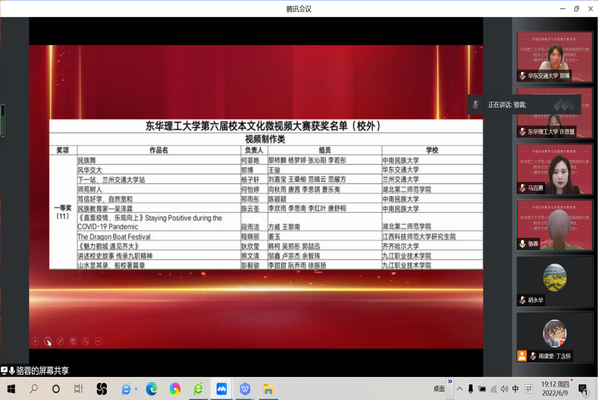 2022年6月9日晚,东华理工大学第六届“中国文化外语微视频大赛”(校本文化主题专赛)开展“云颁奖”员工作品创作分享会。