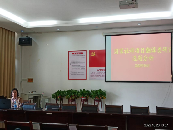 金秋十月,丹桂飘香。10月20日下午,经外语学院翻译研究所精心策划和准备,best365中国官方网站副经理陆秀英教授和研究所成员夏党华老师在学院102会议室进行了了关于国家社科翻译类研究选题分析的分享。本次学术沙龙由 副经理、翻译研究所所长陆秀英教授主持。
