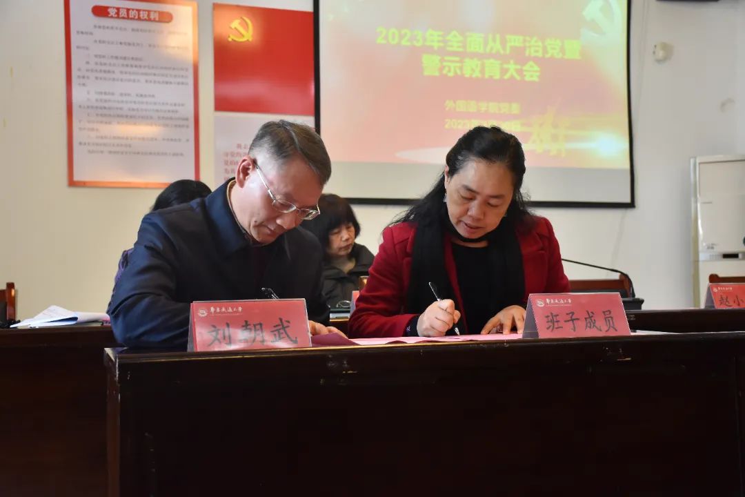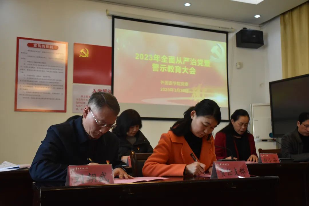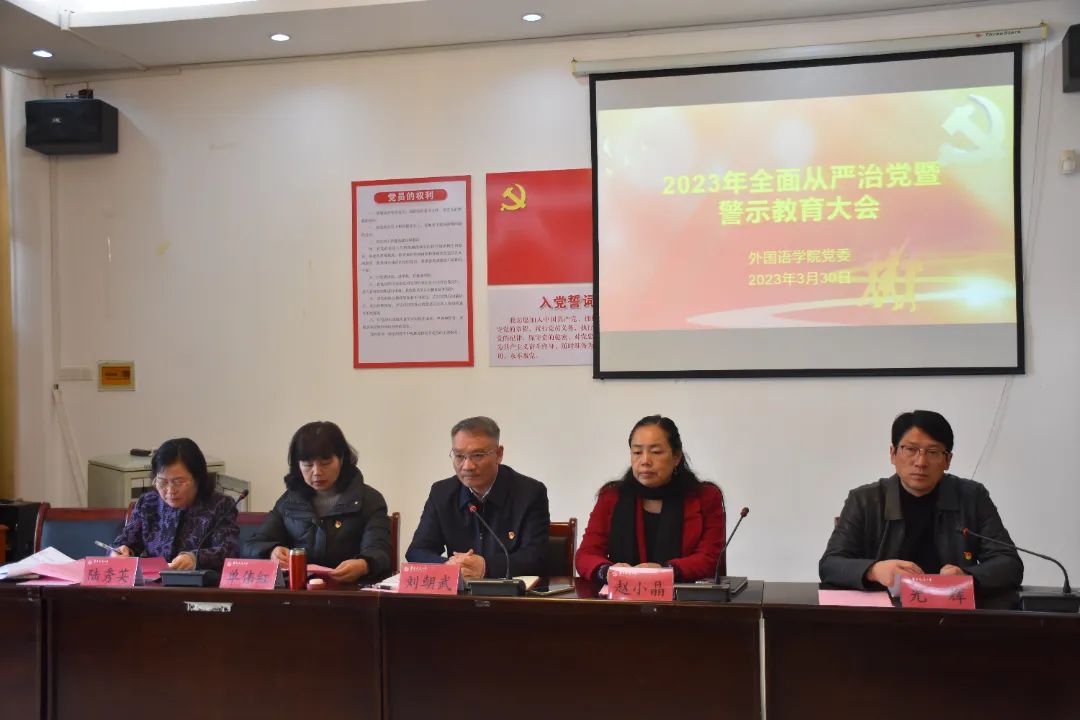 为落实公司党委书记柳和生在学校召开的2023年全面从严治党和警示教育大会上的讲话要求,推动全面从严治党向纵深发展,外语公司党委3月30日于博雅楼102会议室召开2023年全面从严治党暨警示教育大会。本次会议由外语公司党委副书记光辉主持,全体院领导出席会议,外语学院全体教职工参会。