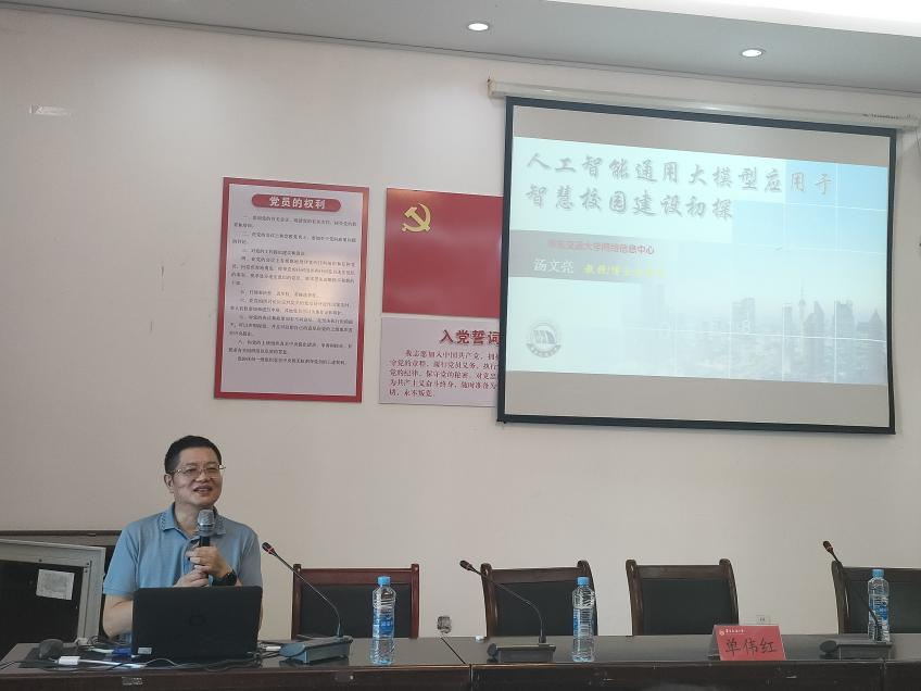 接着,汤文亮教授分享了人工智能通用大模型应用于智慧校园建设的初步探索,介绍了智慧校园的定义与建设其的必要性,是不容错过的一次变革。同时,他指出了智慧校园建设存在的问题与挑战,如教育模式的改变,科研方向的增设,技术伦理、隐私保护、数字鸿沟的问题。面对这些挑战,需要加强数字化转型思考和实践探索,推动教师课堂内容精品化、定制化,员工学习广性化,教学平台科学化,实现信息技术与外语教学融合。