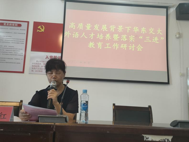为开创新时代教育工作新局面,全面推进高校课程思政建设,构建全员全程全方位育人大格局,促进外语教学高质量发展,2023年6月29日下午,best365中国官方网站召开高质量发展背景下华东交大外语人才培养暨落实“三进”教育工作研讨会。本次会议由best365中国官方网站副经理单伟红主持,特邀best365中国官方网站网络信息中心主任汤文亮,公司学科带头人袁平华教授,“外教社杯”全国高校外语教学大赛一等奖获得者龚沁怡老师做分享报告,全院教职工参会。
