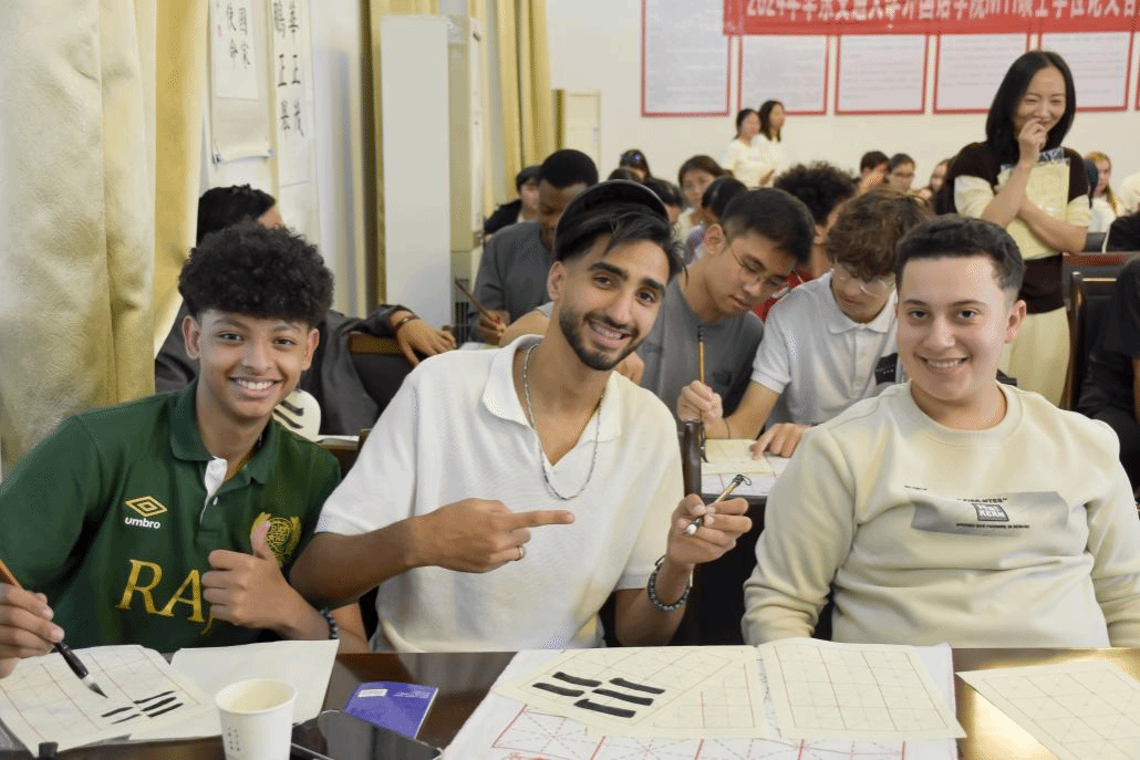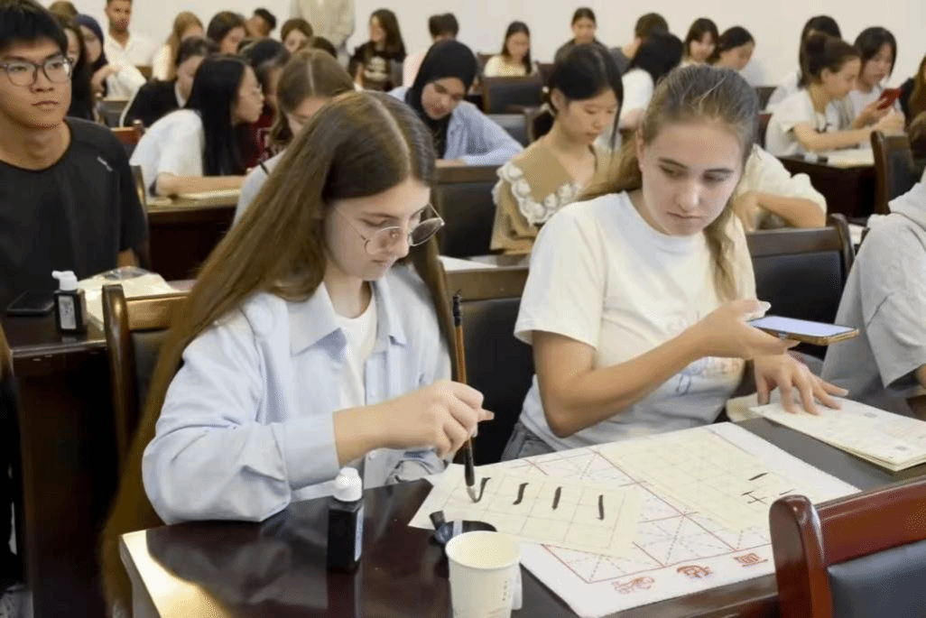 接着,老师为同学们分发毛笔、宣纸、墨水、摹本等工具,开启实际操作和体验环节。同学们根据光辉老师的现场示范和指导进行实操练习,从“横”“竖”“横折”等简单笔画到汉字的书写,同学们展现出高度的热情,并在书写过程中体会到汉字的精妙之处,收获了无穷的乐趣。