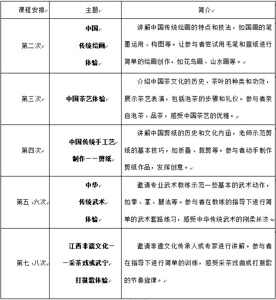 第七、八次 | 江西非遗文化——采茶戏或武宁 打鼓歌体验 | 邀请非遗文化传承人或专家进行讲解。参与者在指导下进行简单的训练,感受采茶戏曲或打鼓歌的节奏旋律。 |