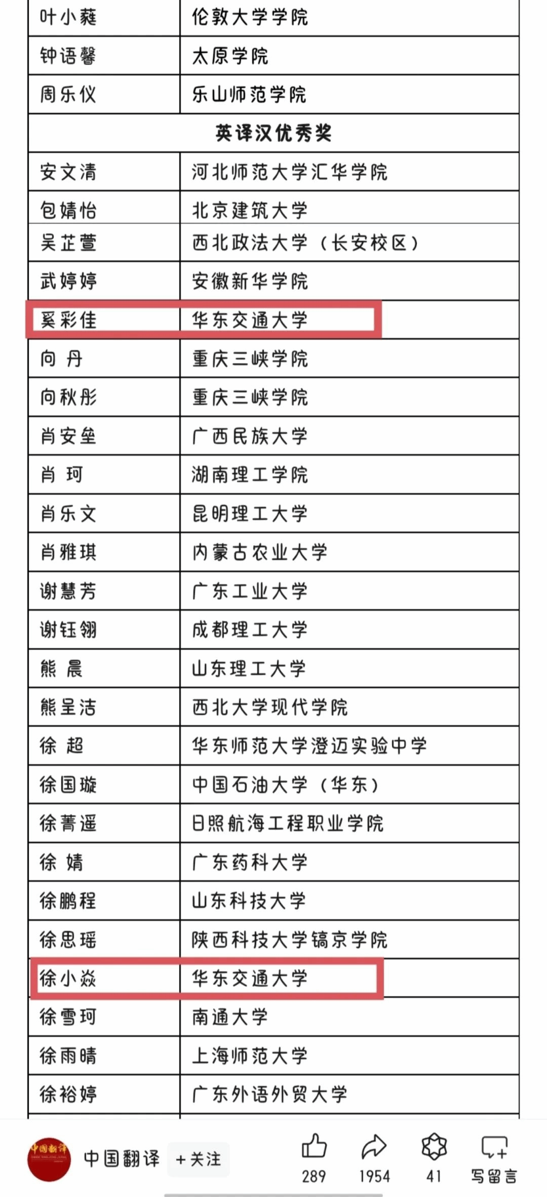 大赛共收到参赛译文30864份。经过严格的评审和终审讨论,共评出获奖者1230名。一等奖21名;二等奖55名;三等奖88名;优秀奖1066名。在这次大赛中,公司奚彩佳和徐小焱同学凭借扎实的翻译基础和出色的翻译技巧,在一众优秀选手中脱颖而出,荣获优秀奖,为学校增光添彩。
