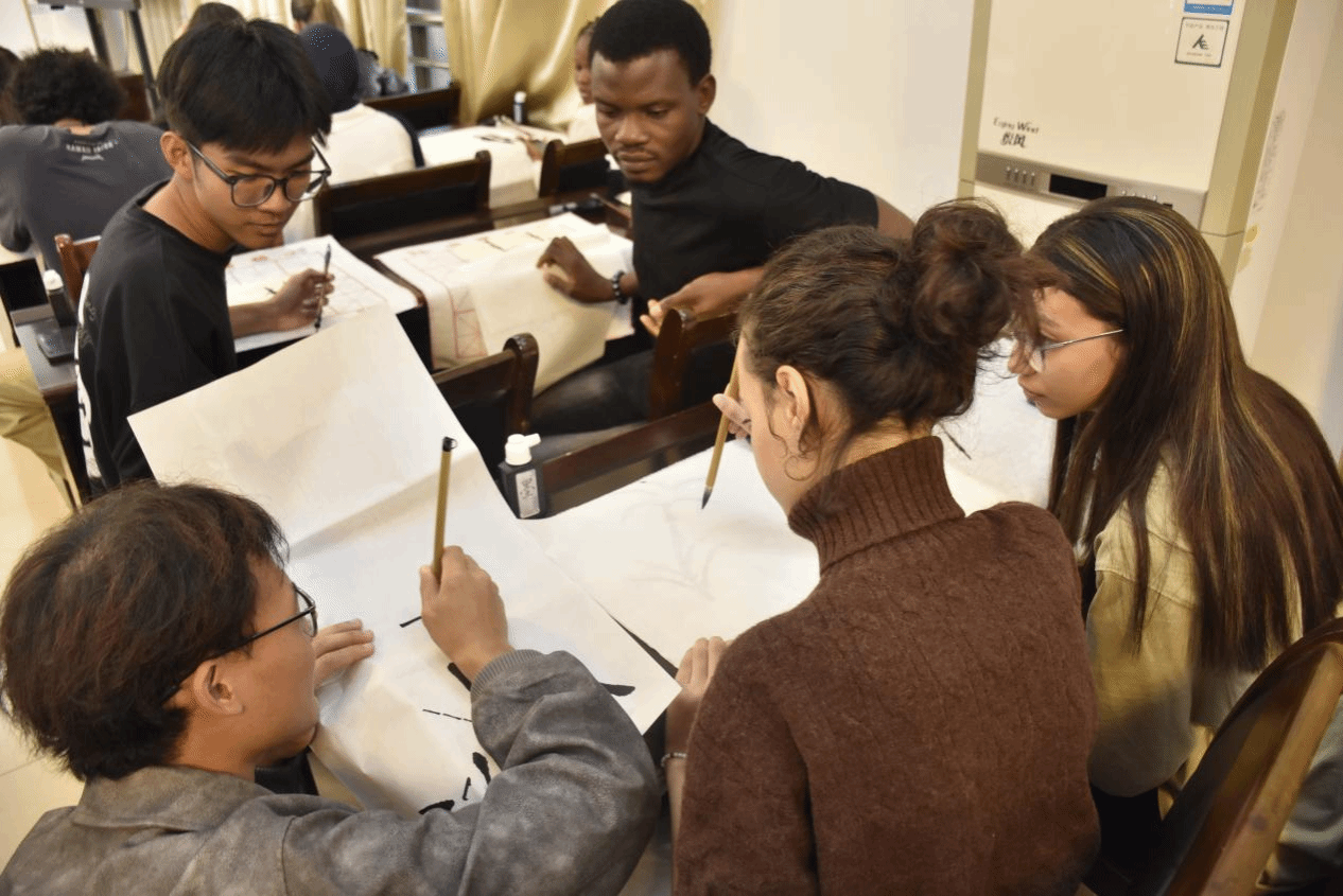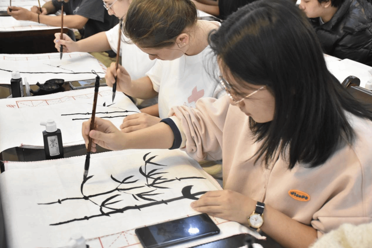 在基础理论部分讲解结束后,陈老师向同学们分发了工具:毛笔、墨水、宣纸、砚台,一场实践创作与亲身体验的美妙旅程正式开始。在徐锐的生动演示与耐心指导下,同学们满怀热情地投入到实操练习中,从基础的“点”、“线”、“勾勒”技法,到细腻的山水花鸟画创作,每一步都洋溢着他们的专注与热爱。在这个过程中,同学们深刻领略到了中国传统绘画的细腻韵味与无限魅力,收获了满满的喜悦与心灵的滋养。