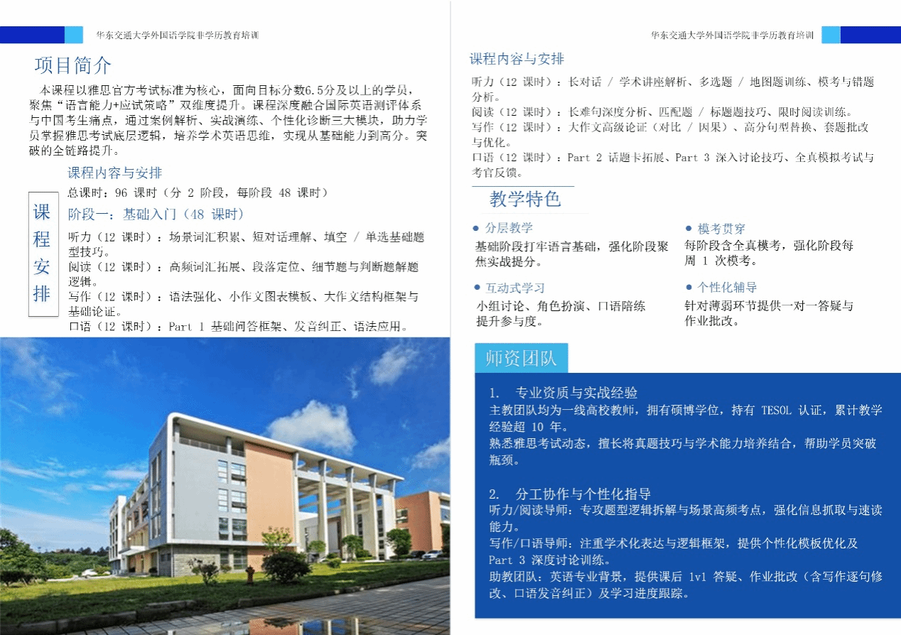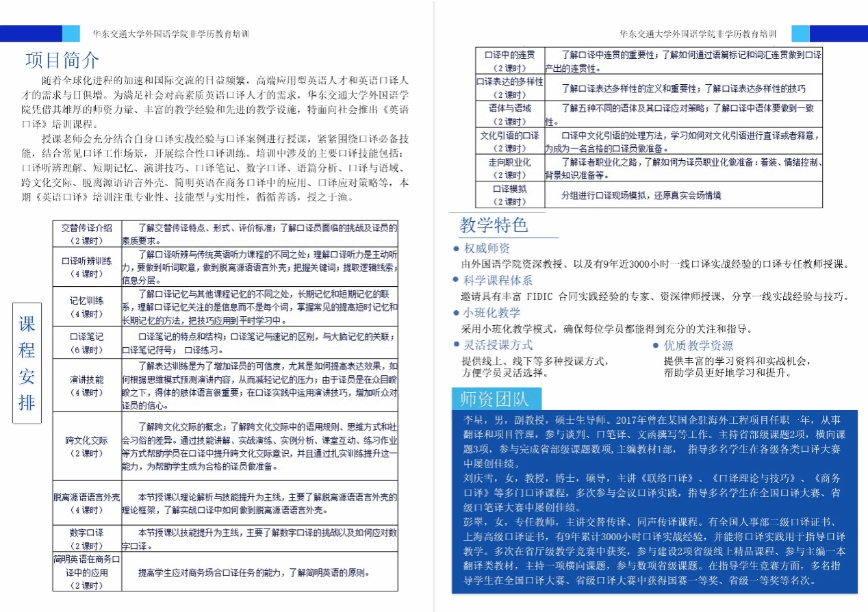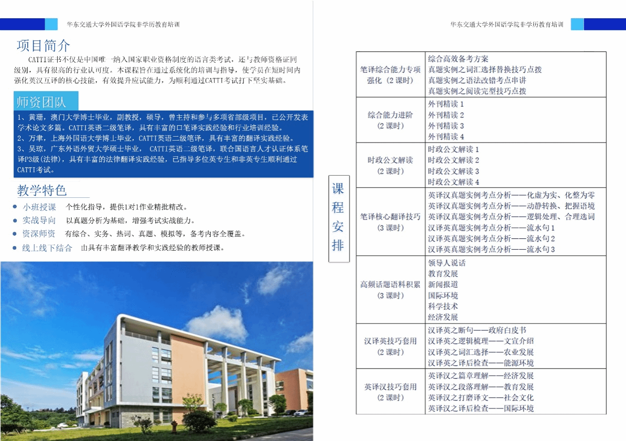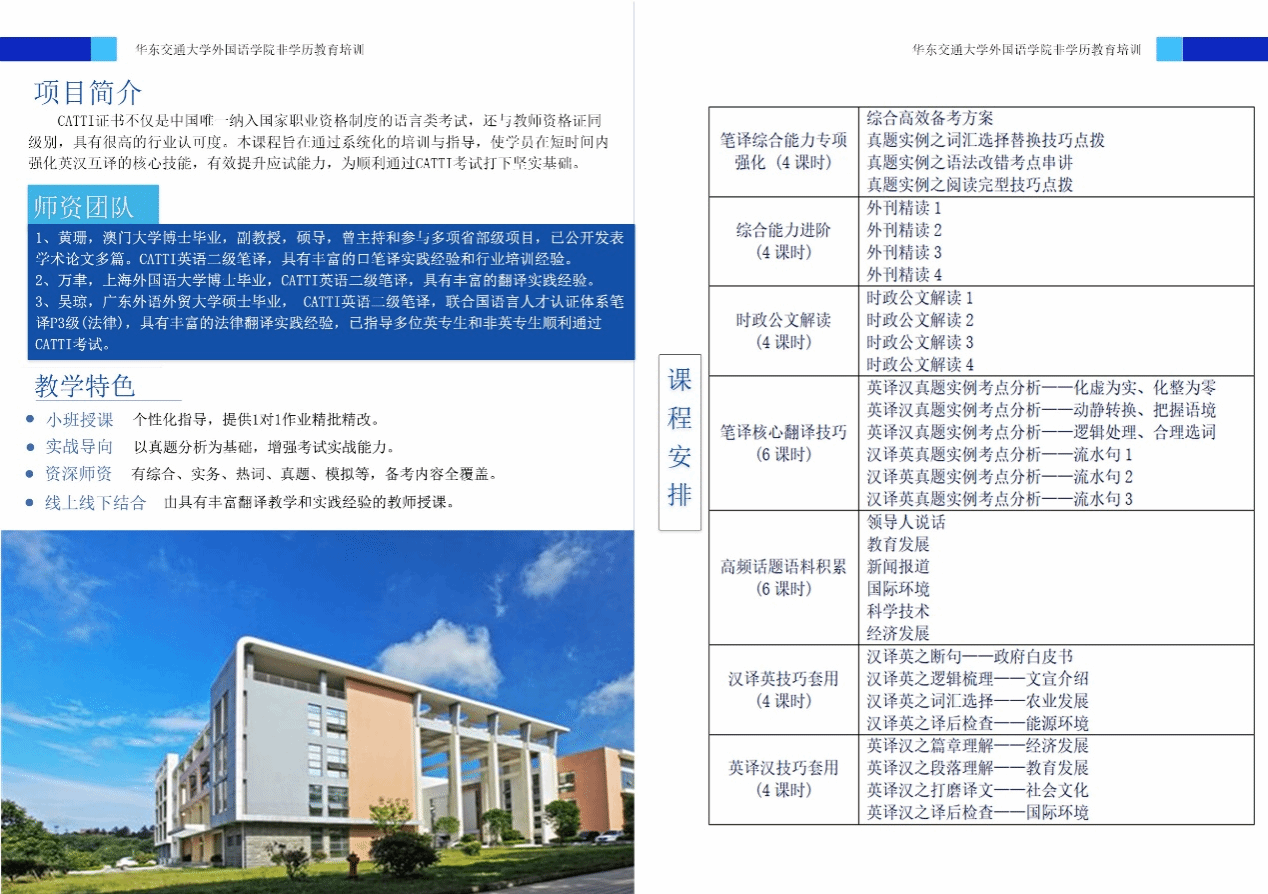 随着全球化进程的加速和国际交流的日益频繁,出国留学人员、高端应用型英语人才及英语口笔译人才的需求与日俱增。为满足社会对高素质英语人才的需求,best365中国官方网站凭借其雄厚的团队力量、丰富的教学经验和先进的教学设施,特面向社会推出《雅思双阶全能冲刺班》、《CATTI二级笔译》、《CATTI三级笔译》及《英语口译》等培训课程。各课程项目简介、课程安排、教学特色及团队团队等详细信息见下图。