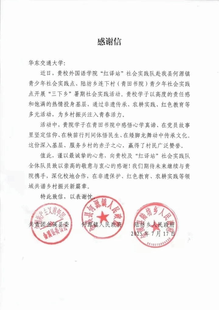 实践队的乡村振兴实践赢得了金溪县各界的认可,共青团金溪县委特发来感谢信。这场暑期大思政实践,如同一把钥匙,打开了青年学子认知乡村的多维视角——在红色基因中汲取信仰力量,在非遗技艺中触摸文化根脉,在农耕实践中理解民生之本。正如队员们在心得中所言:“当我们的脚印与乡村的土地重合,当我们的目光与历史的星辰对望,青春便有了更厚重的刻度。