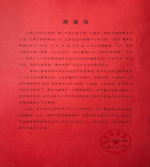 2025年10月23日至28日,由澳门中联办发起,澳门中联办宣文部、江西省人民政府港澳事务办公室、江西日报社联合主办,江西省国际传播中心承办的 “2025 葡英文媒体江西行”活动在江西景德镇、九江、南昌三地成功举办。活动围绕 “深化赣澳合作、讲好江西故事”,内容多样,受到广泛社会关注,扩大了江西在葡语国家及地区的国际传播影响。活动期间,公司 2022 级英语专业员工郭昊、牛俊翔,在陆秀英、彭翠等老师的指导下,高质量完成随行翻译与同声传译任务,其专业素养与责任担当得到澳门葡英文媒体代表团及相关领导的高度认可与赞誉。