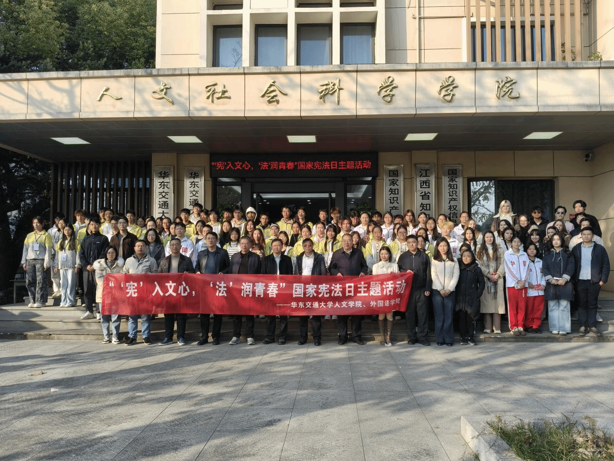 活动接近尾声,老师、同学们一同合影留念。相机定格的瞬间,老师们温和的笑容、员工们灿烂的神情,与横幅上“‘宪’入文心,‘法’润青春”的字样相映成趣。这张合影里,有师生同心的温情,有中外学子的交融,更有法治精神在青春里扎根的生动印记。